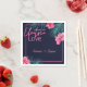 Celebrate your marriage with a splash of neon! Our electric love neon wedding napkin is perfect for couples seeking a bold nightlife vibe, with a modern retro-classy aesthetic. Inspired by the beauty and trendiness of neon signs, we’ve created glowing pink neon style sign typography, paired with illuminating electric green and aqua tropical palm leafy greenery and pink hibiscus. A moody dark blue backdrop is paired with electric accents of pink, green & aqua to create this trendy, electrifying design-savvy wedding suite collection. All of the watercolor artwork is hand-painted by us with custom typographic effects to create our unique memorable neon wedding theme design.