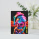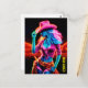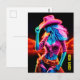 Electric neon farm girl in pink hat under night postcard