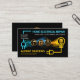 Your prestigious name and job title in yellow supplies power to a yellow electrical bulb. An electrical lightning zaps thru three gold electrical icons to reach the blue power plug. Just above the plug is a slogan caption which you can change. To the right side of this is the business name and its contact details.