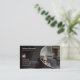 This electrician business card features an electrician testing the circuits breakers using electrician tools. The image appears within a semi-sphere on the right side of the card. The left side of the card features a translucent black background that allows the background image to faintly show through. Your name, title, logo and business address appears within this black background.
