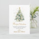 Modern Elegance Gold Calligraphy Script Christmas Tree Non Photo Christmas Cards. This festive minimalist Christmas Holiday cards features a watercolor christmas tree with decoration gold balls and confetti and a „Merry Christmas” greeting text which is written in a nice hand written script in gold on white. On the reverse christmas tree pattern on dusty green background. This festive Custom Photo Christmas Cards are a great way to remind loved ones that you're thinking of them this Winter Holiday Season.