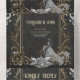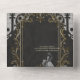 Elegance in silver and black. This image features a black and white illustration of a wedding frame with intricate gold and silver embellishments. The frame is adorned with ornate floral patterns and a central archway. A bride in a flowing gown, holding a bouquet, stands within the frame, facing away from the viewer. The background is a textured black surface, creating a dramatic and elegant atmosphere.