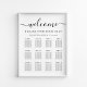 Elegant downloadable wedding seating chart poster for up to 12 tables featuring "welcome" in a stylish script with swashes, "Find Your Seat," your names and wedding date in elegant serif typography, and the table numbers and guest names in simple modern typography. Select the digital download option to edit with last minute changes and print locally.