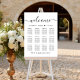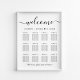 Elegant wedding seating chart poster sign for up to 12 tables featuring "welcome" in a chic script with swashes, your names and wedding date joined together by a heart and "We're so glad you're here" in classic serif typography. If desired, select the digital download option to edit with last minute changes and print locally.