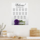 This elegant wedding seating chart has 14 tables and exudes a romantic, sophisticated, and beautiful design. With table assignments for 140 guests and 10 seats per table, this chart provides ample seating arrangements for your wedding reception. The design features a single long-stemmed deep royal purple rose lying on its side and reflecting in a pool of water. The title, "Welcome! please find your table," is written in fancy script calligraphy, while there is space available for the names of the couple and the wedding date at the bottom. This seating chart is a wonderful way to add beauty, class, and style to your wedding reception while making it easy for your guests to find their seats.