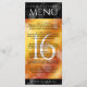 Add sophistication to 16th golden topaz wedding anniversary celebrations with this dinner menu, which features elegant lettering and hexagonal confetti on deep red-yellow-orange moire and black backgrounds. Customise with couple's names, dates of marriage, venue details, menu items, and congratulatory messages.