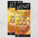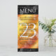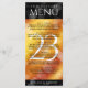 Add sophistication to 23rd imperial topaz wedding anniversary celebrations with this dinner menu, which features elegant lettering and hexagonal confetti on deep red-yellow-orange moire and black backgrounds. Customise with couple's names, dates of marriage, venue details, menu items, and congratulatory messages.