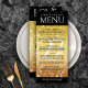 Add sophistication to 27th music wedding anniversary celebrations with this dinner menu, which features elegant lettering and musical note confetti on gold foil and black backgrounds. Customise with couple's names, dates of marriage, venue details, menu items, and congratulatory messages.