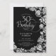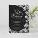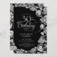 Black silver floral 30th birthday party invitation. Elegant design featuring roses, faux silver foil and typography script font. Trendy invite card perfect for a stylish female bday celebration. Can be customised to any age. Personalise with your own details. Printed Zazzle invitations or instant download digital printable template.