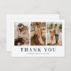 Show your wedding guests you care with our elegant thank you cards! Designed with a chic white background, these cards feature a unique 3 photo collage template, custom 'thank you' title, and personalised details including your names and wedding date. On the reverse is a heartfelt personalised message which will make your guests feel appreciated.