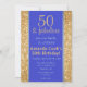 This modern "50and fabulous" birthday invitation is designed with elegant glittery looking gold borders. The centre background is blue and is bordered on both sides with a line of lighter blue to compliment the design. The text uses elegant typography in matching blue and gold ink. The text colours and font can be changed easily using the edit menu if you choose. The back of the invitation continues the gold glittery looking theme.