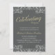 A stylish invite for your golden 50th wedding anniversary party. The text reads "Celebrating 50 years" in an elegant golden script against a charcoal grey background. Beautiful light grey swirls along the top and bottom of the invite frame the text.