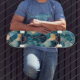 This elegant skateboard design features a contemporary fan-like pattern inspired by Art Deco aesthetics, blending geometric precision with a modern twist. The palette of deep blues and warm gold tones creates a luxurious and stylish vibe, appealing to skaters who value sophistication and uniqueness. The intricate detailing and flowing shapes make this deck not just a functional piece but a statement of art, perfect for both everyday riders and collectors seeking premium design. A standout option for fans of modern elegance and geometric art.