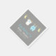 A cute napkin for the baby shower parties for baby boys! It has mini baby clothes and accessories which includes items like yellow baby socks, a white baby jumpsuit with a bow tie and a pastel blue overalls with pocket hanging on a clothesline with wooden pegs. Pastel colours just stands out on the grey background and gives an elegance to it. Personalise easily with your party message.