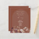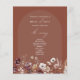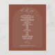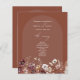 Autumn inspired floral and botanical design at bottom with dark terracotta rust arch and background. Text is white.