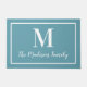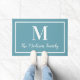 Freshen up your home's entrance with this elegant custom monogram doormat in aqua / teal blue and white colours. Note, colours can be modified. Personalise with your family's last name in script and a serif style monogram initial. Design includes a simple framed border.