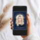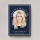 Elegant dark blue graduation announcement featuring the grad's photo in an arch frame, "Graduate" and their class year in gold serif typography, and their name and school in simple gold typography.