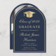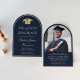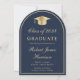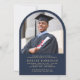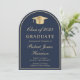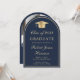 Classic blue arch-shaped college graduation announcement and party invitation featuring a gold grad cap, the graduate's name and class year in an elegant gold script, and their school, major and honours. On the back, add a photo and personalise your party details.