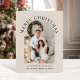 Elegant light taupe Christmas folded holiday card featuring your photo in an arch frame, "Merry Christmas" in classic serif typography, and a seasonal greeting and your family name in simple modern typography. On the inside, personalise your message to friends and family.