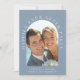 Chic dusty blue elopement or private wedding announcement and reception invitation. The front features your photo in an arched frame and "Happily Ever After Party" in elegant white typography. Under your photo, add your first names, wedding date and location. On the reverse side, personalise your invitation, add your names in a signature-like script and input your wedding website address to create a scannable QR code for your guests to scan to RSVP online and obtain additional details.