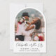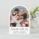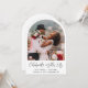 Elegant arch-shaped elopement or private wedding announcement and reception or party invitation featuring your photo in an arch frame, "Celebrate With Us" in a chic script, and your first names, wedding date and location in simple modern typography. On the back, personalise your wedding or elopement announcement and reception or party invitation and add your names in a signature-like script.