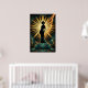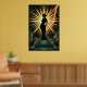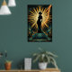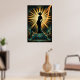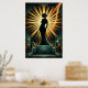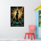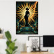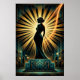 A sophisticated silhouette of a woman in a long gown standing on a geometric pedestal. Set against a radiant golden sunburst, this artwork perfectly captures the 1920s "Great Gatsby" glamour and elegance.