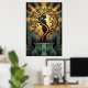 Add a touch of 1920s glamour to your home with this stunning Art Deco illustration. Featuring a sophisticated black silhouette of a woman intertwined with a tree, set against a radiant gold sunburst and deep teal geometric patterns. This elegant piece blends nature with architectural design, making it perfect for modern or vintage-inspired interiors.