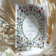 Invite your guests in stunning style with this exquisite wedding invitation, drawing inspiration from the elegant Art Nouveau and Arts & Crafts movements. The design showcases a beautifully symmetric floral border filled with stylised tulips in rich shades of magenta, deep pink, and mauve. Delicate stems in sage green are accented with purple and periwinkle-blue leaves, creating a lush, artistic frame. A patterned oval border in a deep green encircles your wedding details, which are presented in a classic and sophisticated, fully customisable font. This invitation is perfect for a formal, vintage, or garden-themed wedding, appealing to couples with a love for fine art and timeless design.