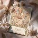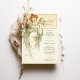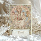 This beautiful wedding dinner menu showcases an exquisite Art Nouveau design, featuring illustrations reminiscent of Alphonse Mucha's iconic style. The front of the menu highlights a serene woman surrounded by intricate patterns and floral motifs in soft, earthy tones of cream, muted gold, sage green, and delicate pastels. The vintage elegance of the illustration evokes a sense of timeless beauty, making it perfect for a classic or art-inspired wedding. The reverse side presents a lovely image of a woman holding a glass, adding a celebratory touch, with the detailed dinner menu printed in an elegant font. Ideal for couples seeking an artistic and vintage aesthetic for their special day.