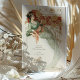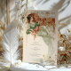 Elevate your wedding with this sophisticated Art Nouveau-inspired drinks menu card. The front side features a mesmerising illustration of a poised woman in a flowing green gown with soft peach accents, set against a backdrop of rich red and gold floral patterns. The artwork exudes timeless elegance and charm, making it a perfect addition to your wedding decor. The reverse side is adorned with a refined botanical emblem in gold and red, adding a touch of vintage sophistication. This menu card elegantly lists a curated selection of cocktails, beer, wine, and spirits, ensuring a delightful experience for your guests.