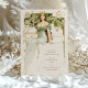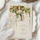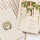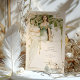Enhance the elegance of your wedding with this stunning Art Nouveau-inspired drinks menu card. The front features a captivating illustration of a regal woman in a flowing green gown, adorned with delicate floral elements and a golden crown, set against a rich green and gold backdrop. This detailed artwork exudes sophistication and timeless beauty, making it a perfect addition to your wedding decor. The reverse side is adorned with a refined botanical emblem in gold and green, adding a touch of vintage charm. This menu card elegantly lists a curated selection of cocktails, beer, wine, and spirits, ensuring a delightful experience for your guests.