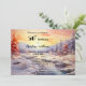 Adult birthday party invitation featuring a watercolor painting of a snow covered river landscape with pine trees at sunset. On the back is an abstract simple design with snowflakes.