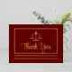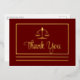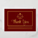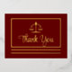 Simple, elegant and modern dark red graduation or professional attorney or other legal professional "Thank You" with real gold foil front law scales of justice and text with rectangular frame and double bottom lines and back black text postcard design with back template for return address. Original design by Holiday Hearts Designs (all rights reserved).