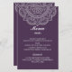 Lovely wedding menu card in aubergine / plum background with white typography and a white mandala. Simple and elegant with beautiful colours.