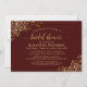 This beautiful bridal shower invitation is both simple and elegant. It features gold text on a chocolate brown or auburn background with lacy gold faux foil frills or filigree in the corners. It has information on both the shower as well as RSVP and registry. Perfect way to celebrate the bride to be in style!