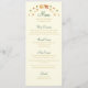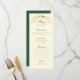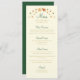 The romance of autumn is captured in this wedding menu. Fall leaves cascade down the card in a flurry of reds, oranges, and golds against a cream background. Oak and maple leaves are prominently featured. A deep forest green adds contrast to the back and sets off a customisable monogram. Fall is in the air with this elegant menu.