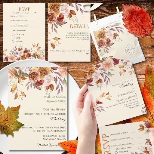 This elegant design features full fall blooms in the best colours of autumn. Including burgundy, cream, orange, browns and deep purple! This design would also be great for summer! The flowers are watercolor and beautiful. The Text is a combination of calligraphy script typography and modern text.