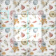 This design features a delicate fall-themed watercolor pattern. The design includes soft and muted tones of pumpkins in shades of white, blue, and light orange, accompanied by an assortment of autumn leaves in various shades of yellow, orange, and brown. Scattered among the pumpkins and leaves are gentle floral elements and sprigs of greenery, all arranged on a clean, white background. The overall aesthetic is light, airy, and evocative of the serene beauty of the fall season.