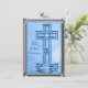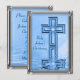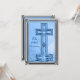 Baby blue tone colours, shown says: "Baby Joshua's Christening" on the front with an original art design of a special cross with star burst all reflected in the peaceful water ripples below. Easily change the name and add your custom text on the back. Remember this special holy day with these unique, artistic, custom invitations / announcements for your family and friends. Great for baptisms, confirmations, First Holy Communion, Easter events, church flyers, and other christian occasions, and also weddings! A beautiful silver border frame look is added to both sides to add to the elegance of the design.