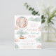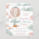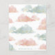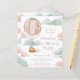 A budget baby gender reveal party invitation. On a white background, an elegant pink hot air balloon is shown carrying a blue baby crib. The sky is decorated with elegant pink and blue gold sparkle clouds. Personalize by adding your full event and contact details to the front and back.