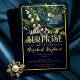 Elegant baroque style dark and moody blue and white floral "SURPRISE" birthday party design. Features dramatically elegant white lily of the valley flowers and dusky blue hawthorn flowers with lush dusky green greenery on a multi-tonal teal to darkest blue background. Add to this the luxury of real gold foil, and you have a birthday celebration that is at once sophisticated and timelessly elegant, but also dramatically modern.
