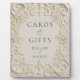 Elegant Baroque Cards & Gifts Wedding Plaque Sign. Elevate your wedding reception with this exquisite Baroque-inspired 'Cards & Gifts' sign. The intricate floral frame and elegant serif font evoke a sense of timeless romance, perfect for a classic or vintage-themed celebration. This tabletop easel sign adds a sophisticated touch to your gift table, guiding guests with grace and style. Its detailed, embossed-like design creates a luxurious feel, making it a beautiful focal point for your special day. Ensure your cherished gifts are well-directed with this stunning piece of wedding decor.