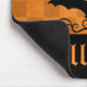 A beautifully elegant black bat silhouette on an orange chequered pattern against a black background. This design features scroll work swirls and Gothic lettering. Shown here on a mouse pad for Halloween.