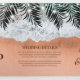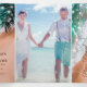 All in one Beach destination wedding trifold invitation featuring a summer tropical beach background, with palm tree leaves and string lights. You are able to add a personalised photo of you and your partner, the wedding details such as accomodation information and present requests, the invitation, and an rsvp postcard for your guests to cut off and send back.