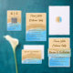 Modern coastal wedding invitation featuring soft blue ocean waves and sandy beige watercolor textures. Perfect for beach weddings, seaside ceremonies, summer weddings, and destination celebrations. Elegant script typography with a romantic aesthetic.