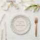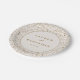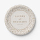 These elegant wedding plates feature a vintage-inspired design with a delicate floral pattern in soft beige, cream, and light brown tones. The central circular element is outlined in gold, complementing the muted gold serif font that highlights the customizable names and date. Perfect for adding a touch of rustic charm to your wedding celebration, these plates create a warm and sophisticated atmosphere. The subtle watercolor-style art technique enhances the romantic and timeless feel, making them ideal for formal occasions.