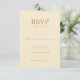 This elegant wedding RSVP card features a minimalist design with a soft beige background and dark brown text, creating a classic and sophisticated look. The layout is clean and organised, with bold serif typography for the "RSVP" heading and a decorative cursive initial "M" adding a touch of refinement. The customisable sections allow guests to indicate their attendance with options like "Joyfully Accepts" or "Regretfully Declines," while the simple line for the number attending ensures clarity. Perfect for formal events, this card conveys an atmosphere of formality and anticipation, making it ideal for weddings and other significant celebrations.