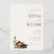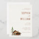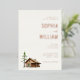 This elegant wedding invitation features a warm beige background with ample white space, creating an inviting and sophisticated atmosphere. The design includes a charming illustration of a rustic wooden cabin surrounded by trees, adding a cosy countryside feel. Prominent script and serif fonts highlight the names "Sophia" and "William," while customisable text fields allow for personalisation. The overall layout is balanced and harmonious, conveying a mood of elegance and tradition perfect for a formal yet intimate gathering.