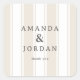 This wedding sticker features a classic and elegant design with vertical beige and white stripes, creating a subtle yet sophisticated background. The typography is the focal point, showcasing bold serif fonts for the names "Amanda & Jordan" and a smaller, lighter font for "thank you," conveying warmth and appreciation. The muted colour palette of soft beige and crisp white enhances its timeless appeal, making it perfect for expressing gratitude at weddings or other formal events. Its clean lines and ample negative space ensure readability while maintaining an understated elegance ideal for any heartfelt occasion.
