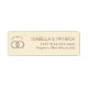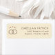 This return address label features a minimalist and elegant design with a beige background, creating a warm and sophisticated aesthetic. The layout includes overlapping circular designs resembling wedding rings on the left, adorned with small dotted patterns, while an arc of red hearts adds a touch of colour above them. On the right side, customisable text is presented in a clean serif font, offering a formal yet modern look. The overall style blends classic elegance with contemporary simplicity, making it perfect for weddings or special occasions that celebrate love and unity.